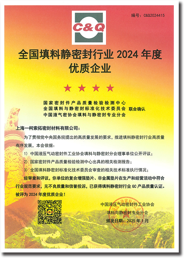 上海一柯索拓密封材料有限公司榮膺"全國填料靜密封行業2024年度優質企業"稱號,以創新密封技術驅動產業未來。